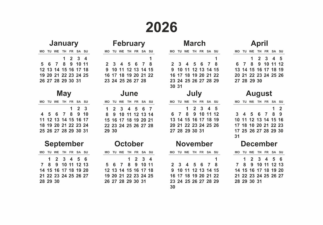 2026 Monday Start Horizontal Black And White Calendar – Idee, Foto & Vorlage